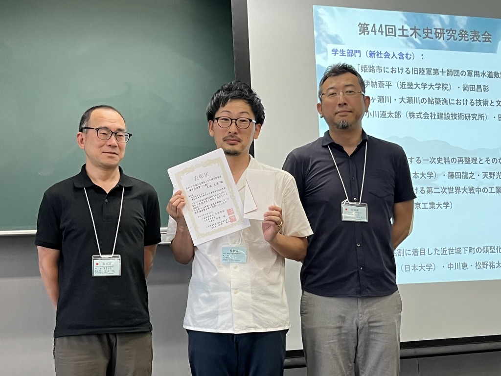 2024年6月22日・23日に名城大学(名古屋市)で開催された 第44回土木学会土木史研究発表会にて「東海地方における第二次世界大戦中の工業都市計画の展開」で若手優秀講演賞を受賞しました。